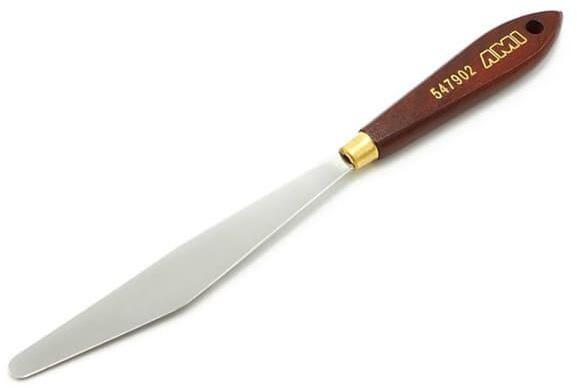 F estőkés rugalmas pengével, sötét színű keményfa nyéllel. Használható keverésre,  festék felhordására, visszaszedésére, különféle minták és strukturált felületek kialakítására, simításra, paletta tisztítására. Penge mérete: 2 x 13,5 cm1 db.