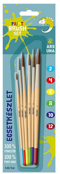 6 db-os ecsetkészlet (2-4-6-8-10-12 méret). Kerek, natúr fa ecsetek, a végén festéssel és valódi póniszőrből készült hegyes ecsetfejjel. Méret: 9,4 cm x 29,8 cm x 0,05 cm. Súly: 40g. Rendelési minimum: 10 db