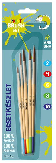 5 db-os ecsetkészlet (2-4-6-8-10 méret). Kerek, natúr fa ecsetek, a végén festéssel és valódi póniszőrből készült hegyes ecsetfejjel. Méret: 9,4 cm x 29,8 cm x 0,05 cm. Súly: 34g. Rendelési minimum: 10 db