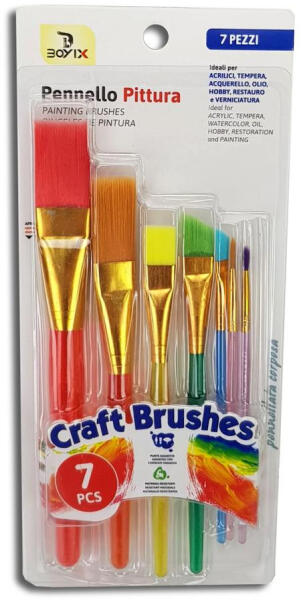 7 részes ecset szett, vegyes színekben és méretekben. Átlátszó, műanyag test, szintetikus fej. Egyenes- és csapott végű ecsetfejek. Lapos és hegyes formák. Akril, tempera, víz, olaj és hobbi festéshez, restauráláshoz ajánljuk.